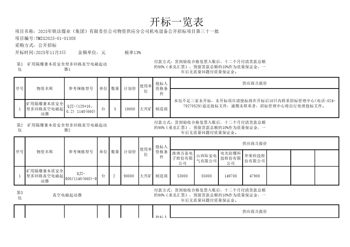 2025年11月3日设备第三十一批公开招标报价一览表(0130S)