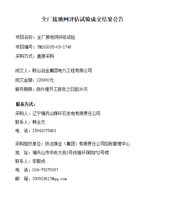 辽宁调兵山煤矸石发电有限责任公司全厂接地网评估试验成交结果公告