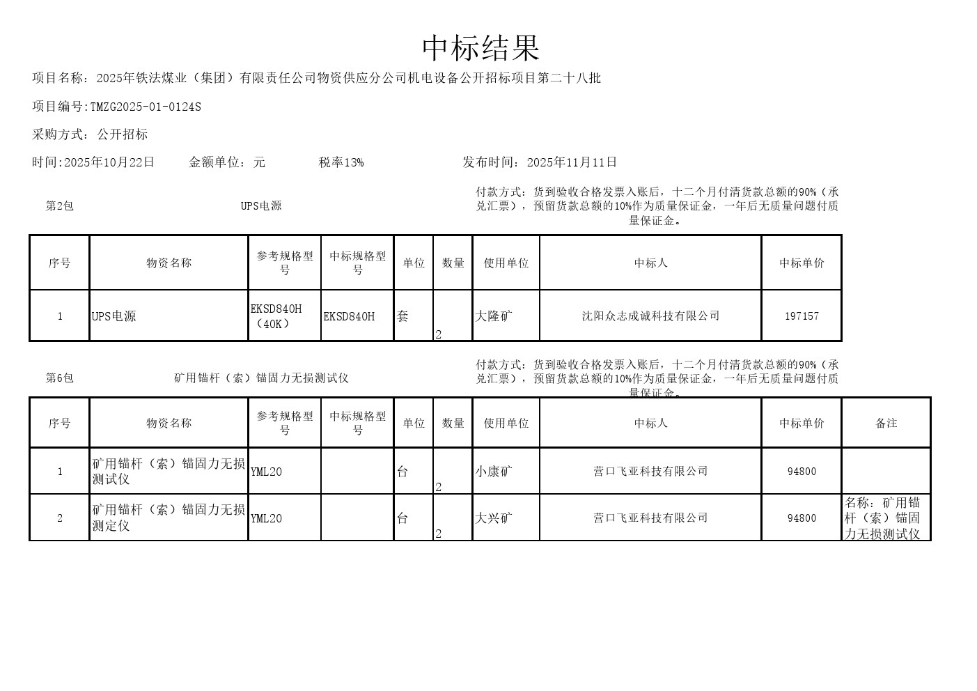 2025年10月22日设备第二十八批公开招标中标结果公告(0124S)