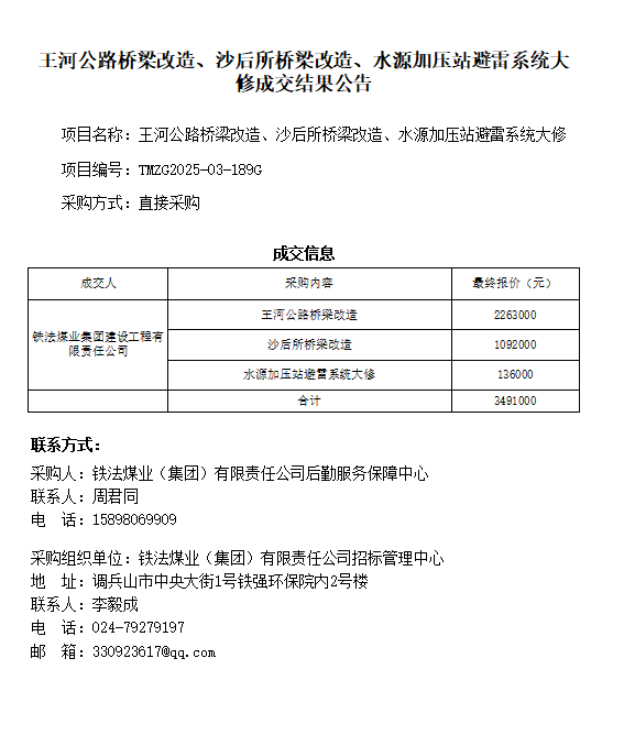 铁法煤业(集团)有限责任公司后勤服务保障中心王河公路桥梁改造、沙后所桥梁改造、水源加压站避雷系统大修成交结果公告