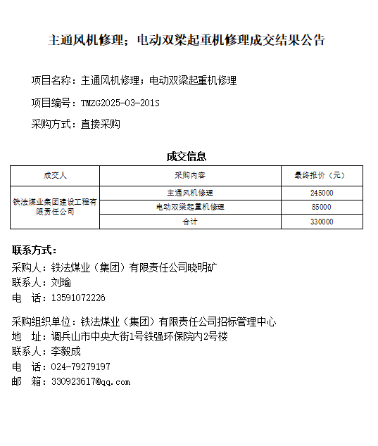铁法煤业(集团)有限责任公司晓明矿主通风机修理、电动双梁起重机修理成交结果公告