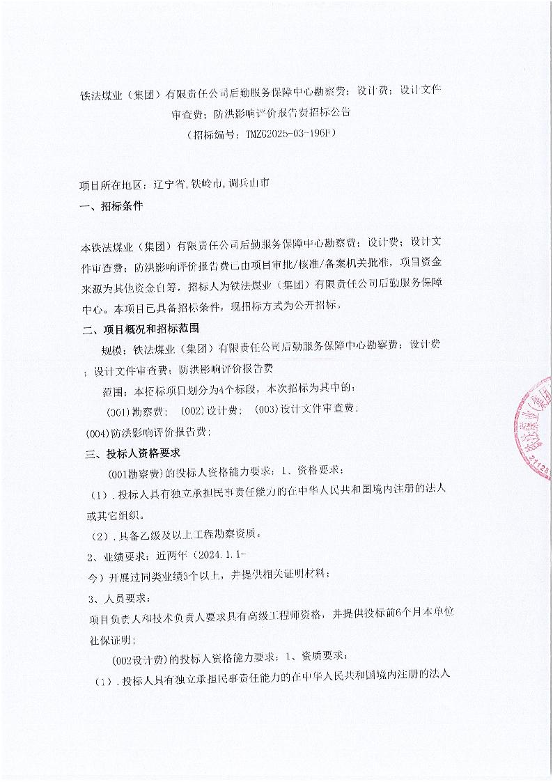 铁法煤业(集团)有限责任公司后勤服务保障中心勘察费;设计费;设计文件审查费;防洪影响评价报告费招标公告