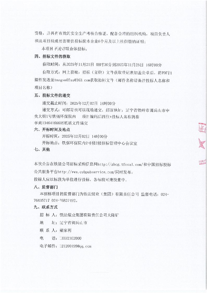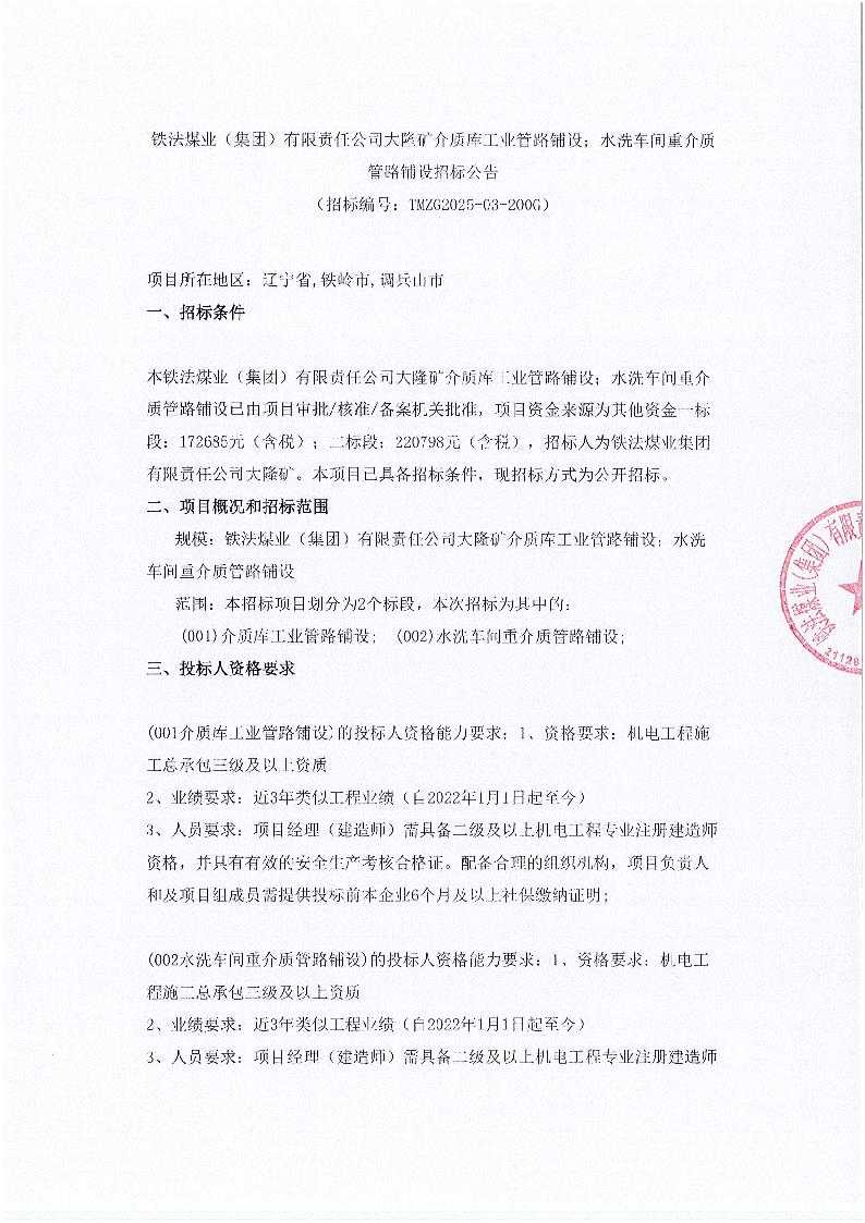 铁法煤业(集团)有限责任公司大隆矿介质库工业管路铺设;水洗车间重介质管路铺设招标公告