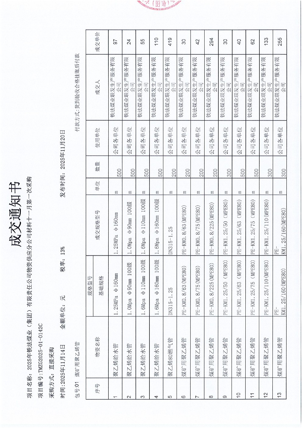 2025年11月14日材料直接采购成交通知书(0142C)
