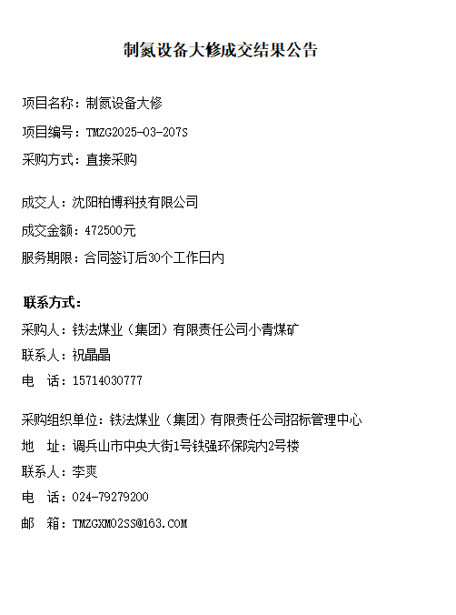 铁法煤业(集团)有限责任公司小青煤矿制氮设备大修成交结果公告