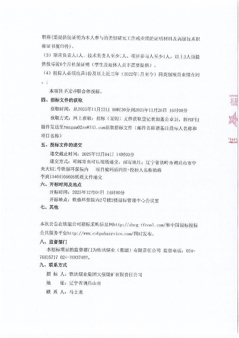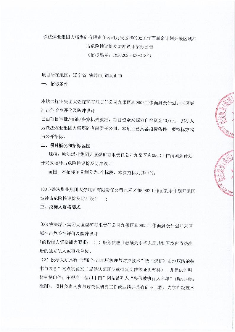 铁法煤业集团大强煤矿有限责任公司大强煤矿九采区和0902工作面剩余计划开采区域冲击危险性评价及防冲设计招标公告