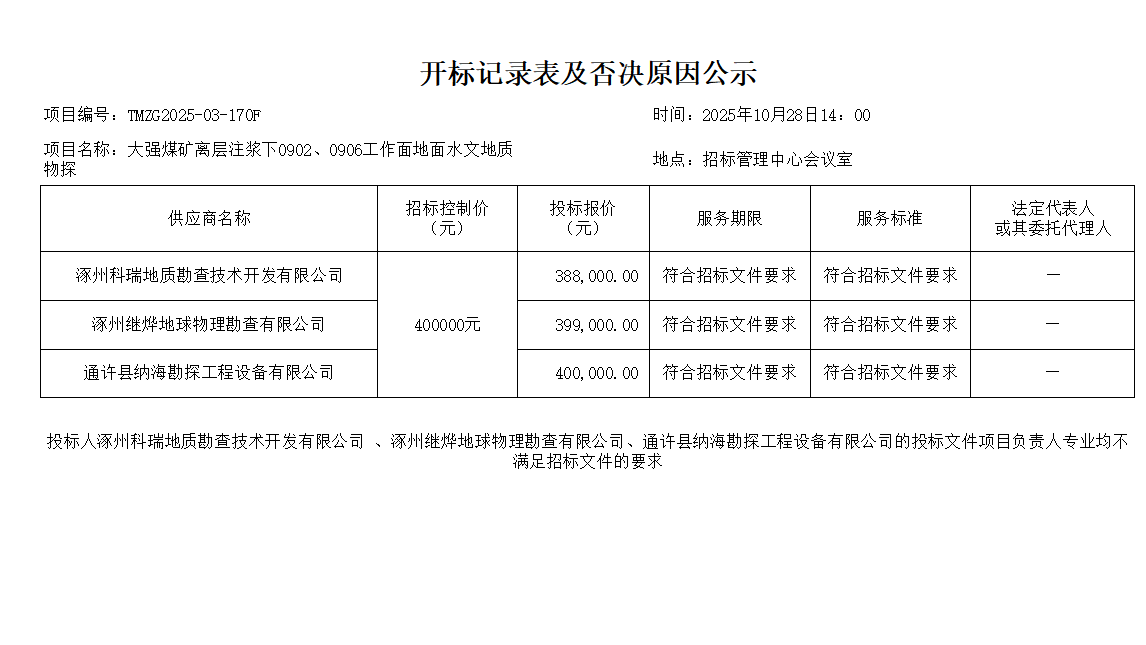 铁法煤业集团大强煤矿有限责任公司大强煤矿离层注浆下0902、0906工作面地面水文地质物探 开标记录表及否决原因公示