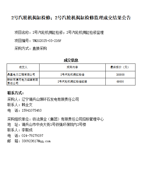 辽宁调兵山煤矸石发电有限责任公司2号汽轮机揭缸检修、2号汽轮机揭缸检修监理成交结果公告