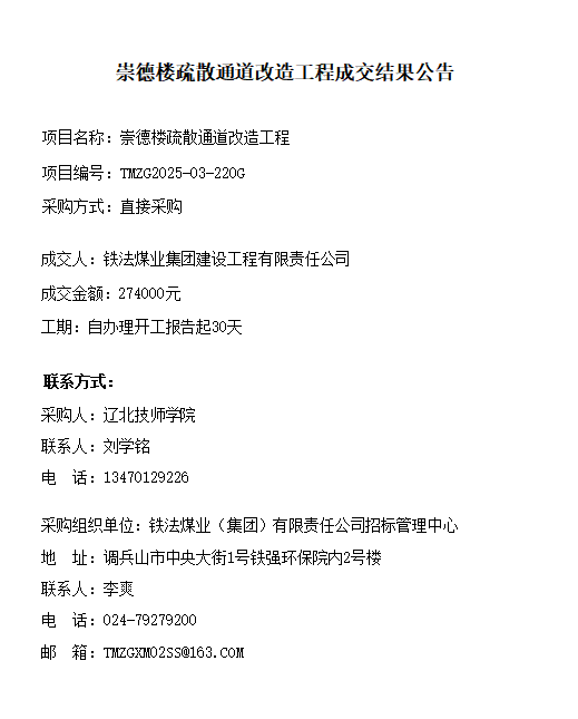 辽北技师学院崇德楼疏散通道改造工程成交结果公告