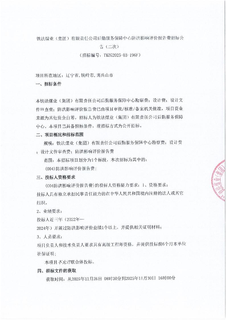 铁法煤业(集团)有限责任公司后勤服务保障中心防洪影响评价报告费招标公告(二次)