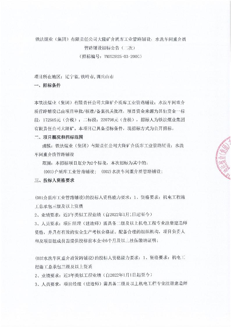 铁法煤业(集团)有限责任公司大隆矿介质库工业管路铺设;水洗车间重介质管路铺设招标公告(二次)