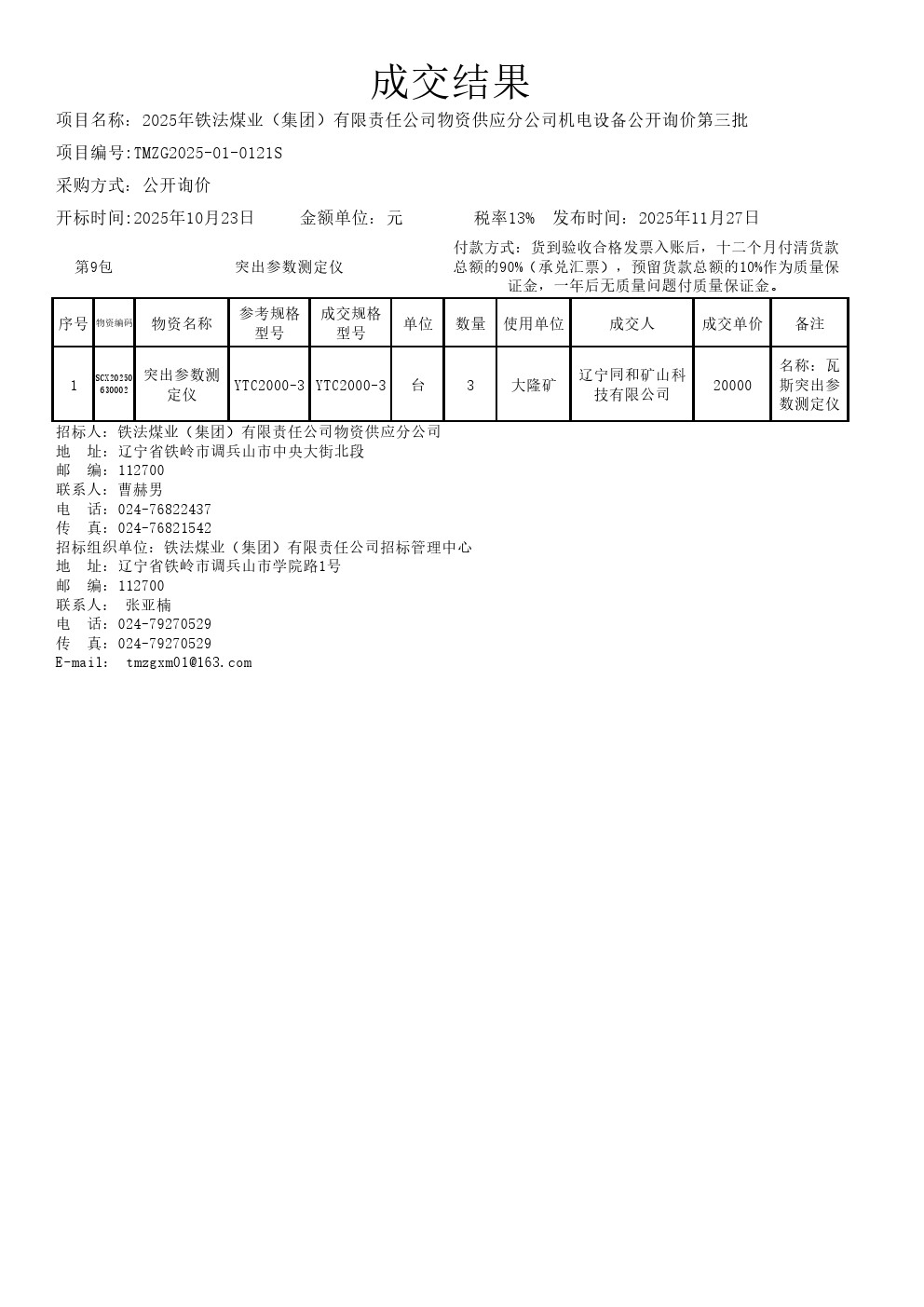 2025年10月23日机电设备公开询价第9包物资名称成交结果更正(0121S)