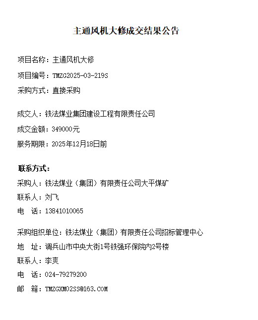 铁法煤业(集团)有限责任公司大平煤矿主通风机大修成交结果公告