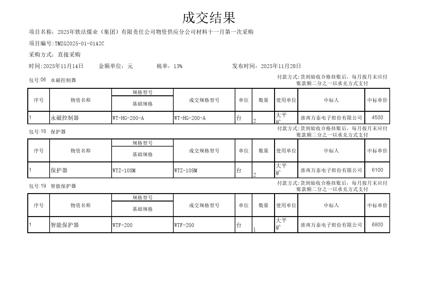 2025年11月14日材料直接采购成交结果公告(0142C)2