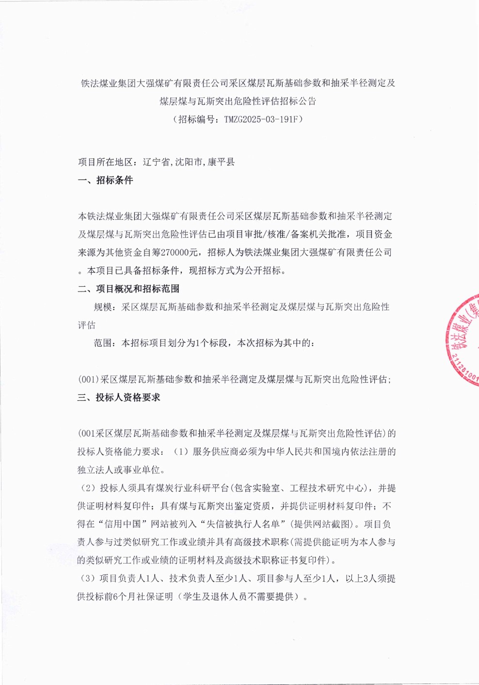 铁法煤业集团大强煤矿有限责任公司 采区煤层瓦斯基础参数和抽采半径测定及煤层煤与瓦斯突出危险性评估招标公告