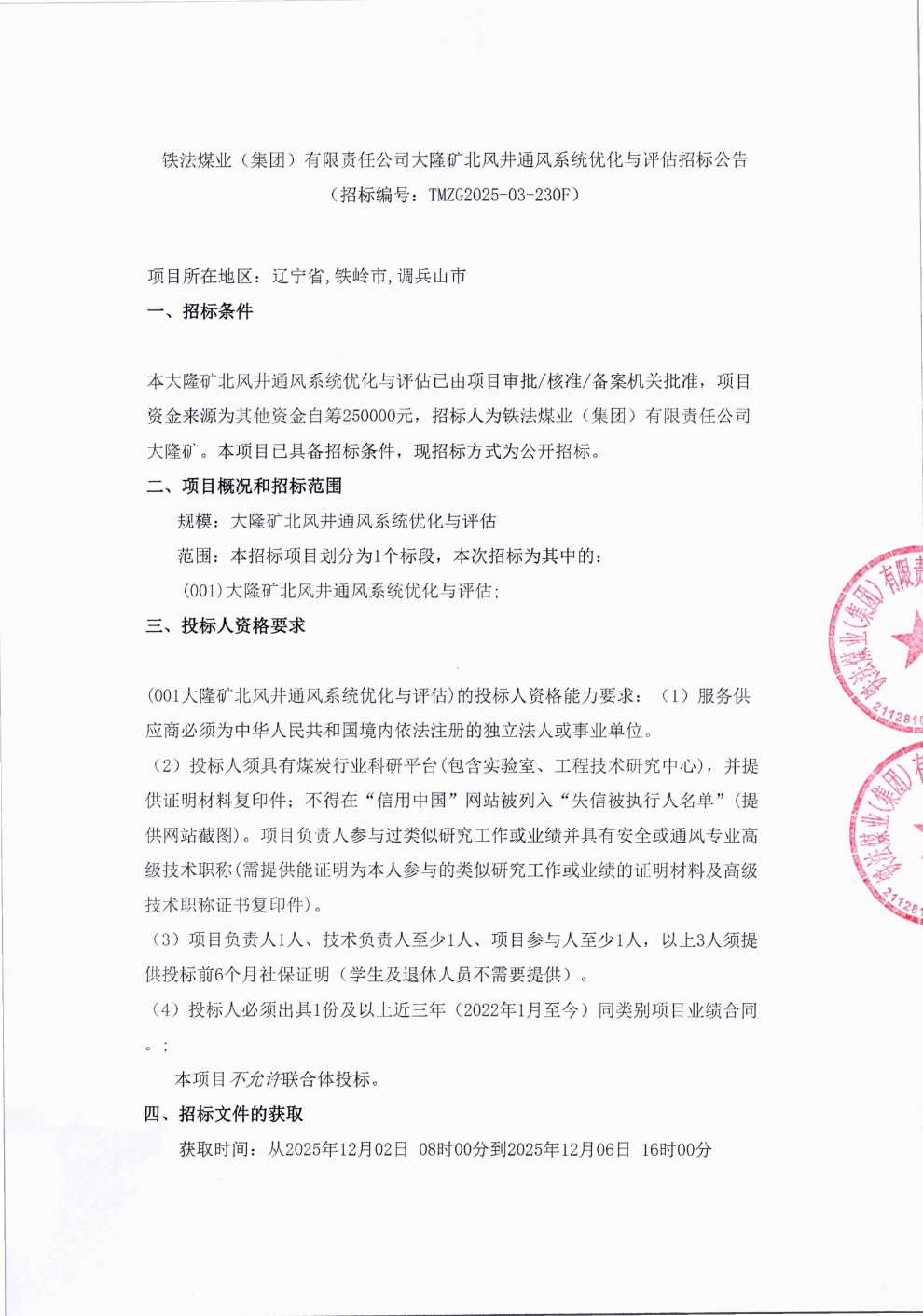 铁法煤业(集团)有限责任公司大隆矿北风井通风系统优化与评估招标公告