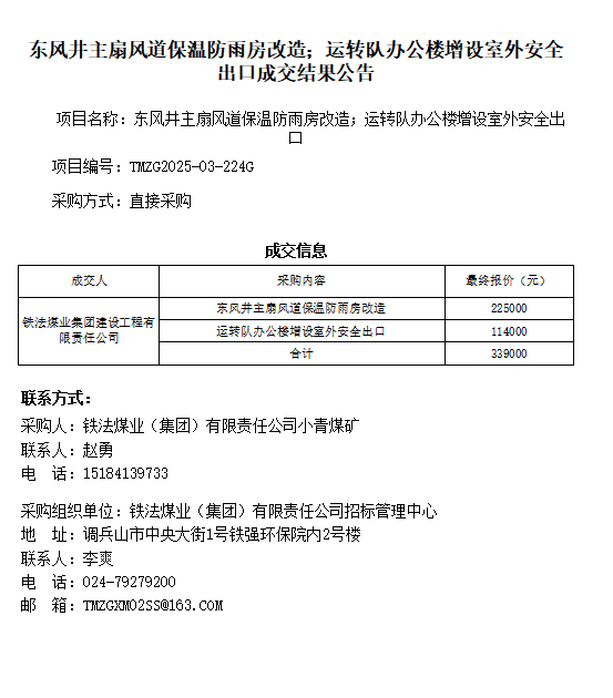 铁法煤业(集团)有限责任公司小青煤矿东风井主扇风道保温防雨房改造;运转队办公楼增设室外安全出口成交结果公告