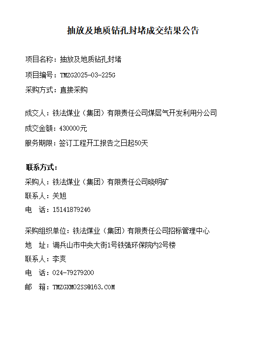 铁法煤业(集团)有限责任公司晓明矿抽放及地质钻孔封堵成交结果公告