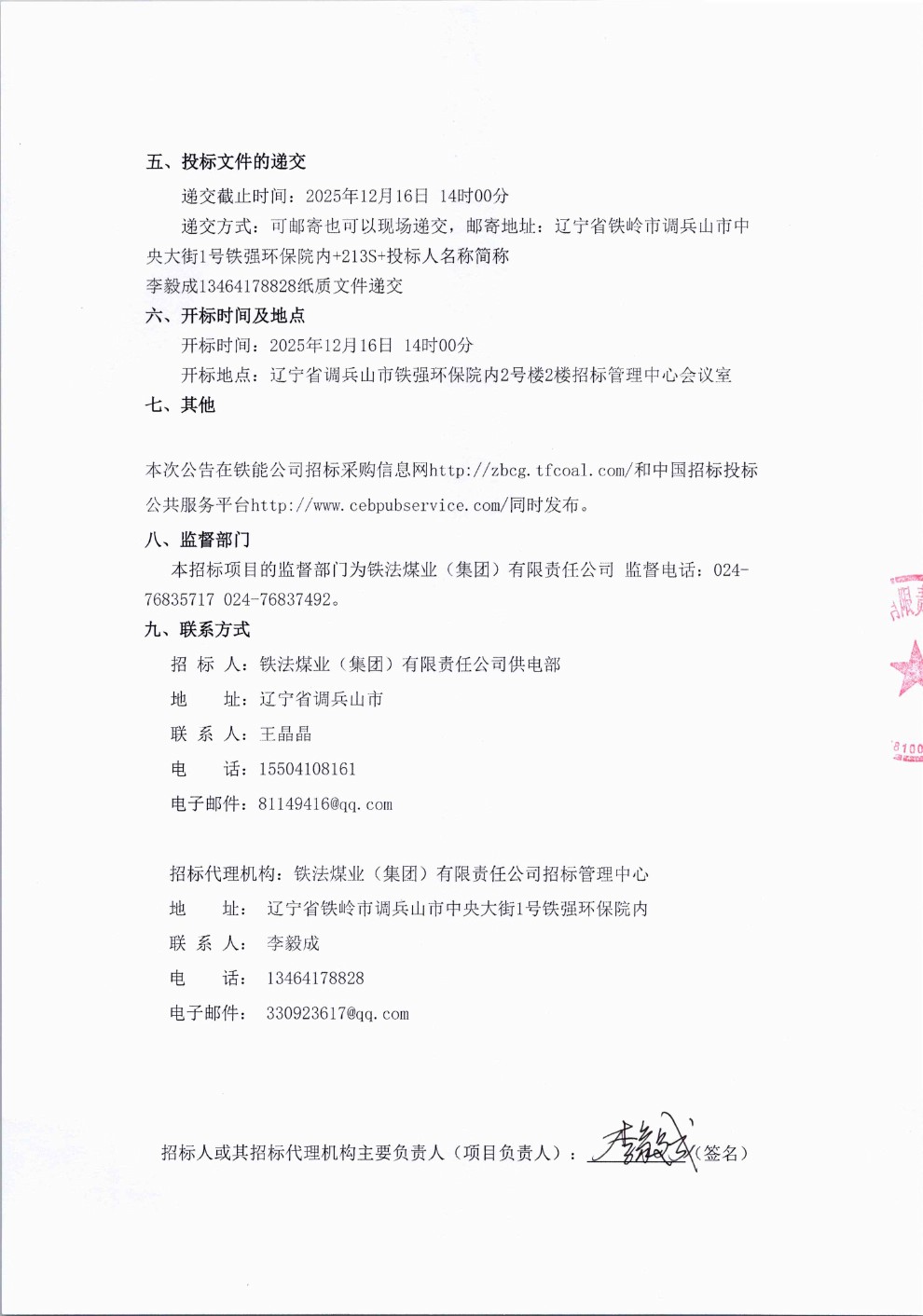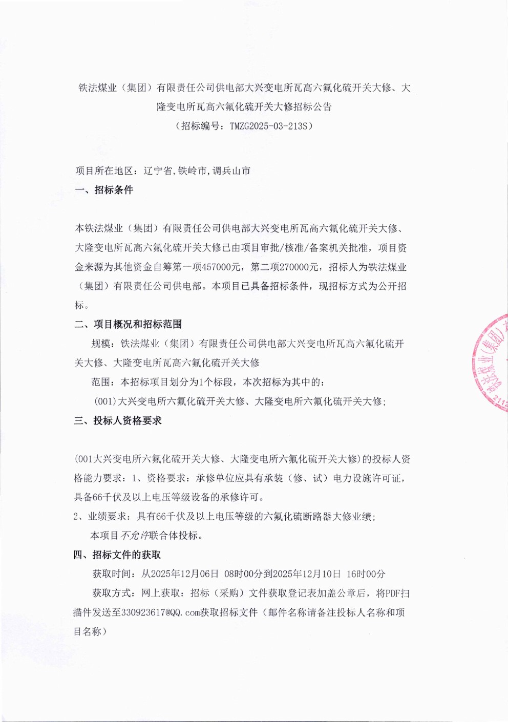 铁法煤业(集团)有限责任公司供电部大兴变电所瓦高六氟化硫开关大修、大隆变电所瓦高六氟化硫开关大修招标公告