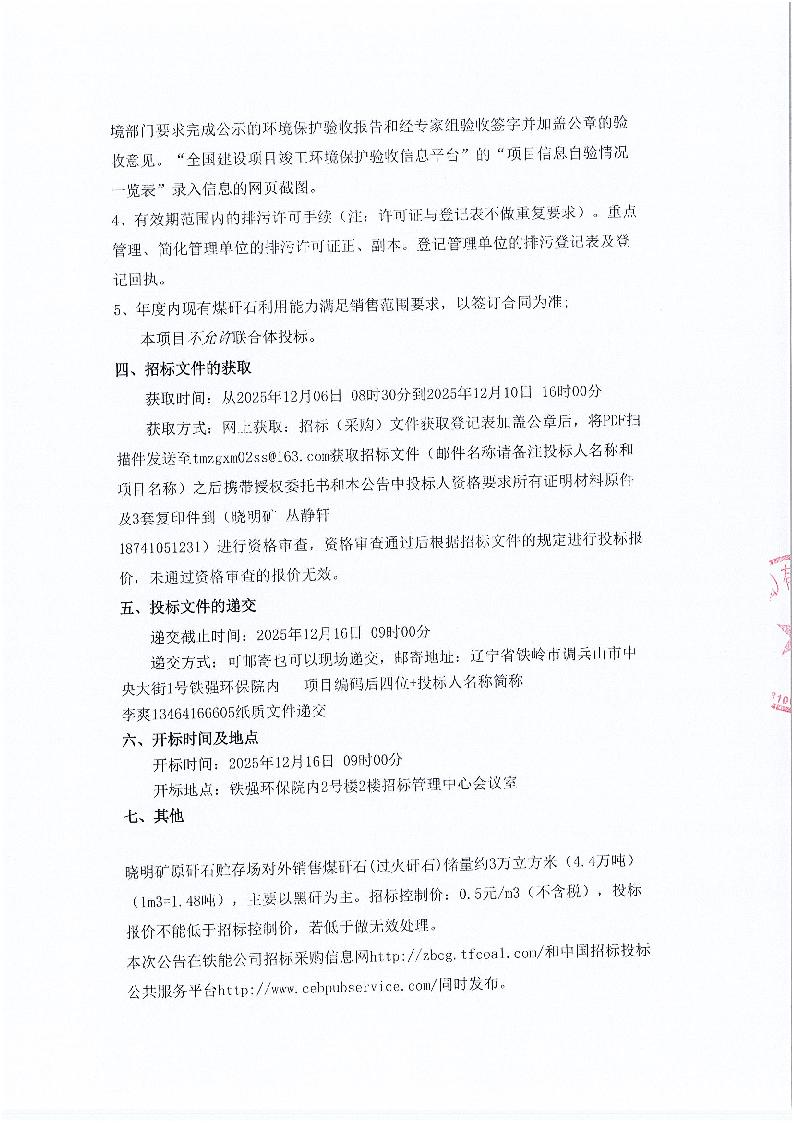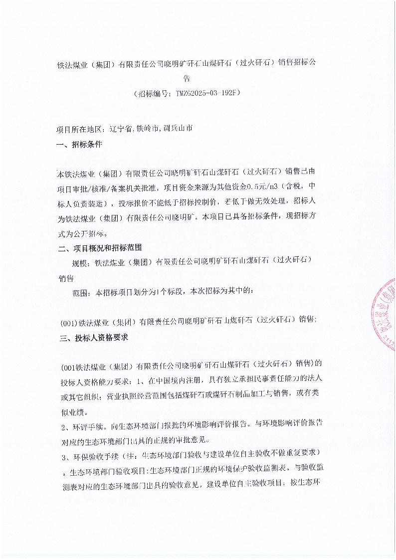 铁法煤业(集团)有限责任公司晓明矿矸石山煤矸石(过火矸石)销售招标公告