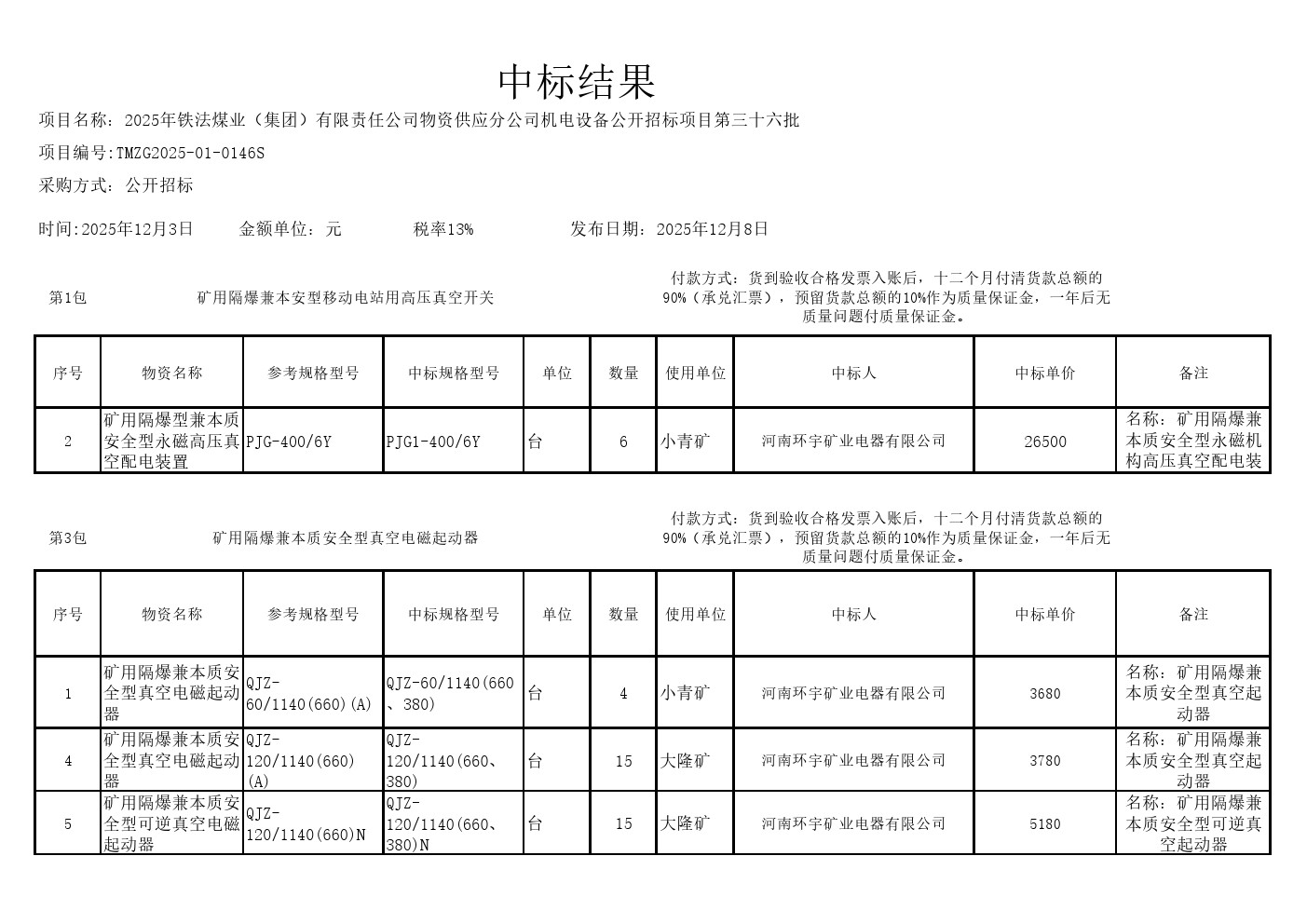 2025年12月3日设备公开招标中标结果公告(0146S)