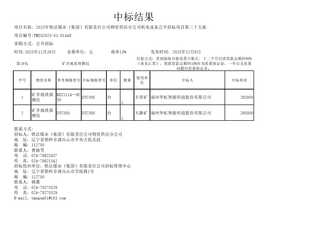 2025年11月26日设备公开招标中标结果公告(0144S)2