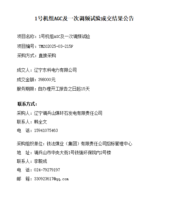 辽宁调兵山煤矸石发电有限责任公司1号机组AGC及一次调频试验成交结果公告