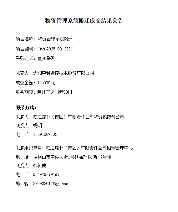 铁法煤业(集团)有限责任公司物资供应分公司物资管理系统搬迁成交结果公告