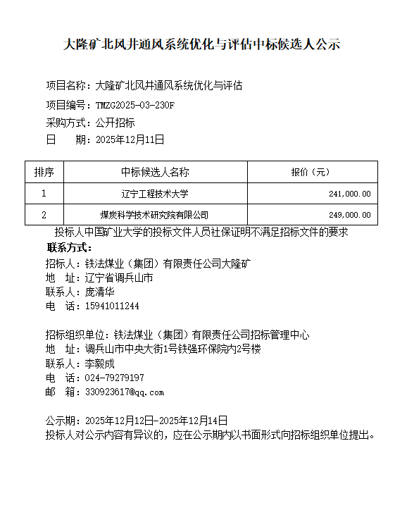 铁法煤业(集团)有限责任公司大隆矿大隆矿北风井通风系统优化与评估候选人及否决原因公示