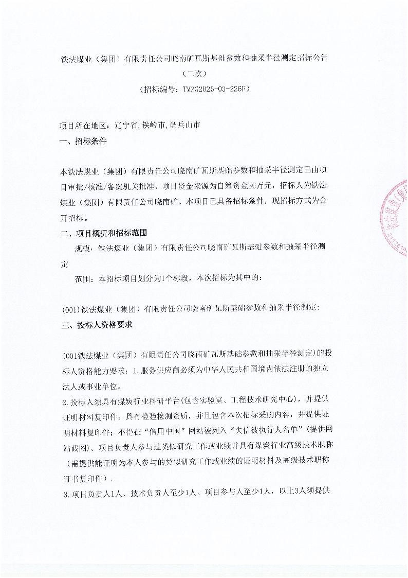铁法煤业(集团)有限责任公司晓南矿瓦斯基础参数和抽采半径测定招标公告(二次)