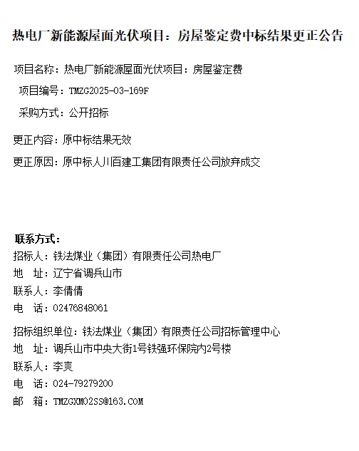 铁法煤业(集团)有限责任公司热电厂新能源屋面光伏项目:房屋鉴定费中标结果更正公告