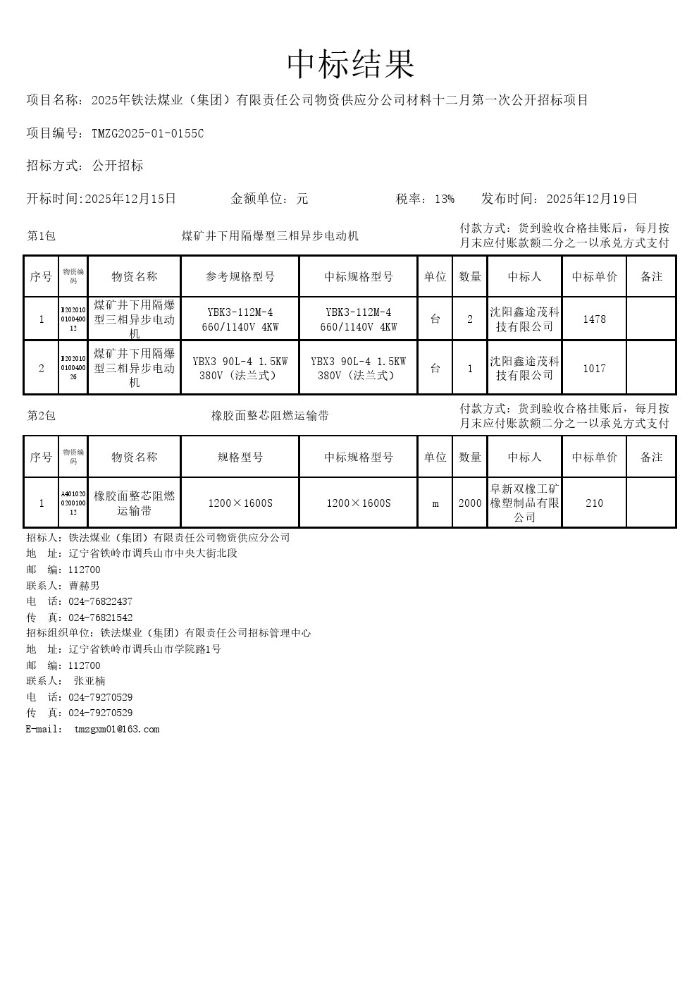 2025年12月15日材料公开招标中标结果公示(0155C)