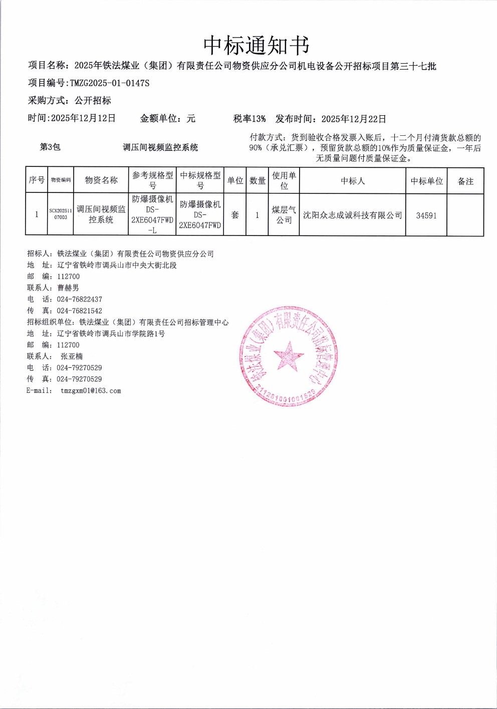 2025年12月12日机电设备公开招标中标通知书公示(0147S)-2