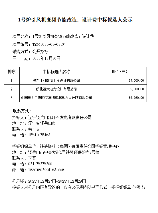 辽宁调兵山煤矸石发电有限责任公司1号炉引风机变频节能改造:设计费中标候选人公示