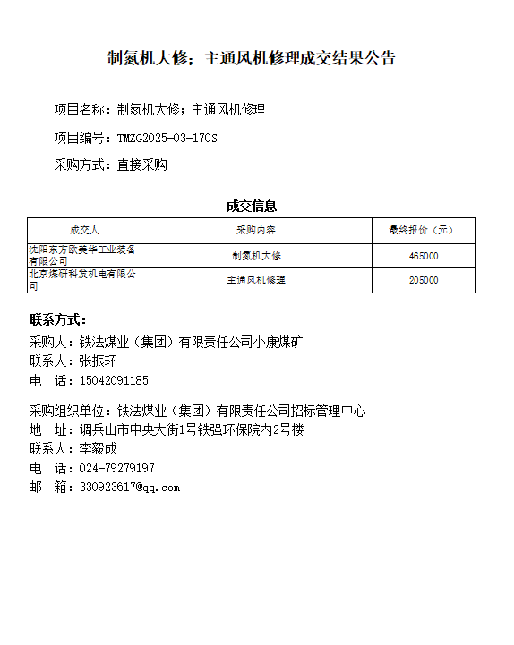 铁法煤业(集团)有限责任公司小康煤矿制氮机大修;主通风机修理成交结果公告