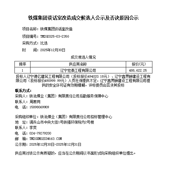 物资招标一科 电话、传真:024-79270529 邮箱:tmzgxm01@163.com 物资招标二科 电话、传真:024-79270522 邮箱:tmzgxm02@163.com 工程服务招标科 电话、传真:024-79270521 邮箱:tmzgxm03@163.com