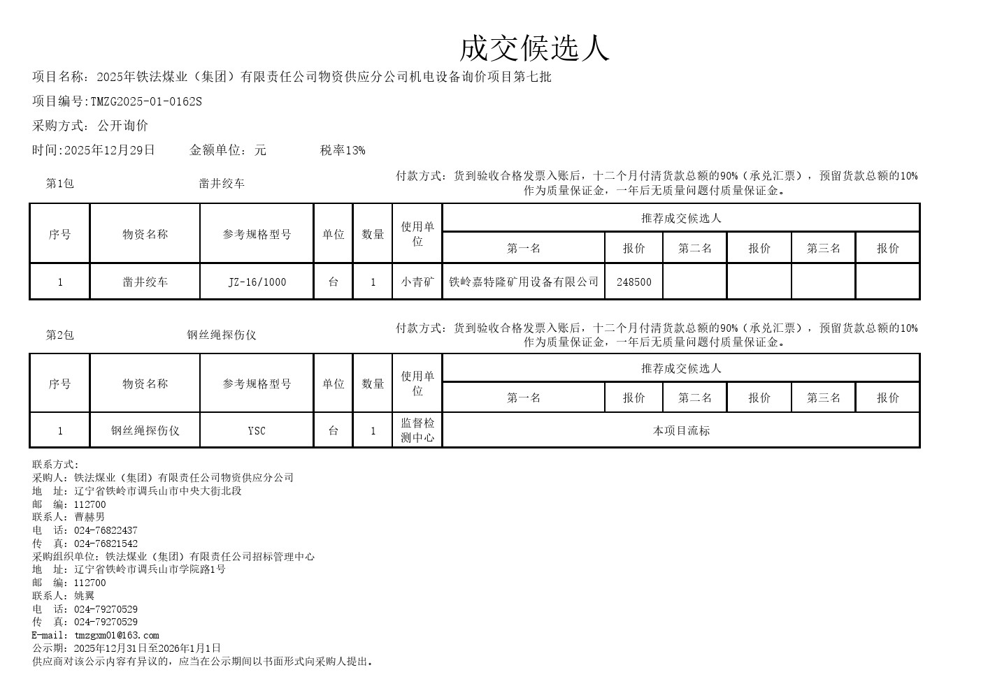 2025年12月29日设备公开询价成交候选人公示(0162S)
