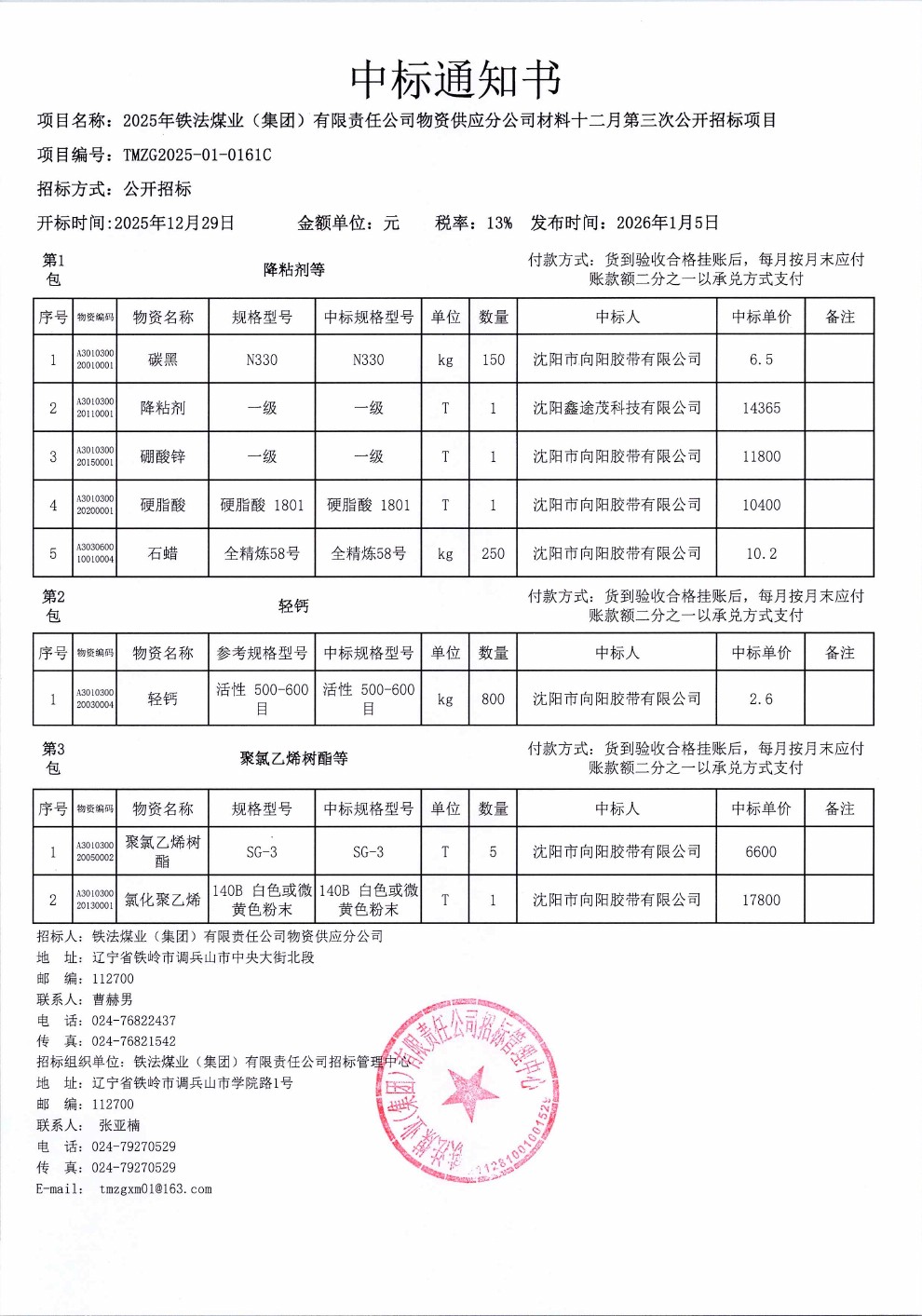2025年12月29日材料公开招标中标通知书(0161C)
