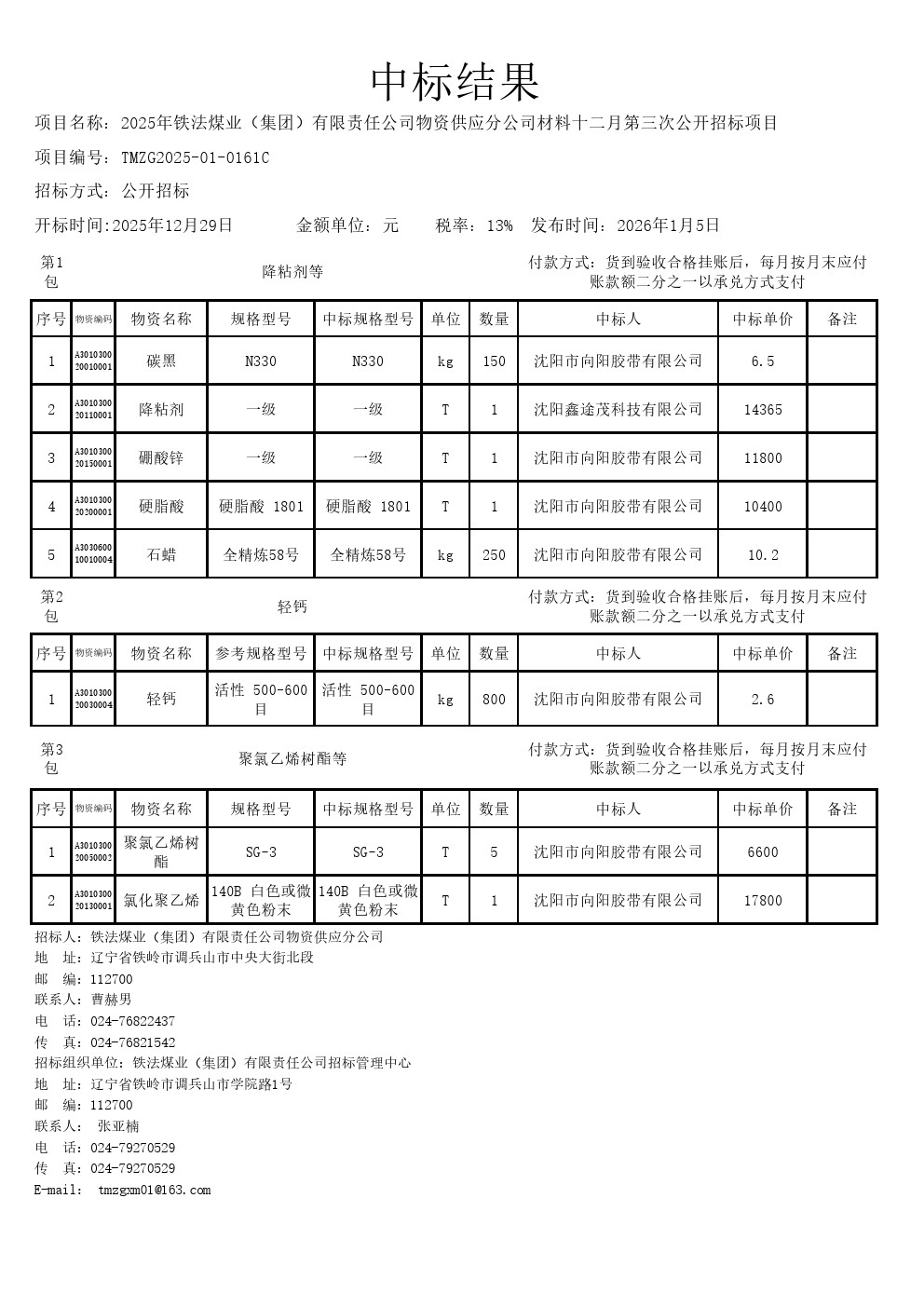 2025年12月29日材料公开招标中标结果公示(0161C)