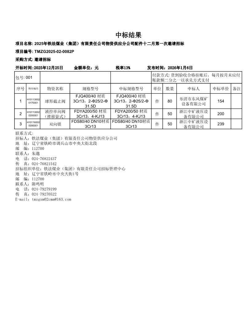2025年12月25日配件中标结果(0082P)