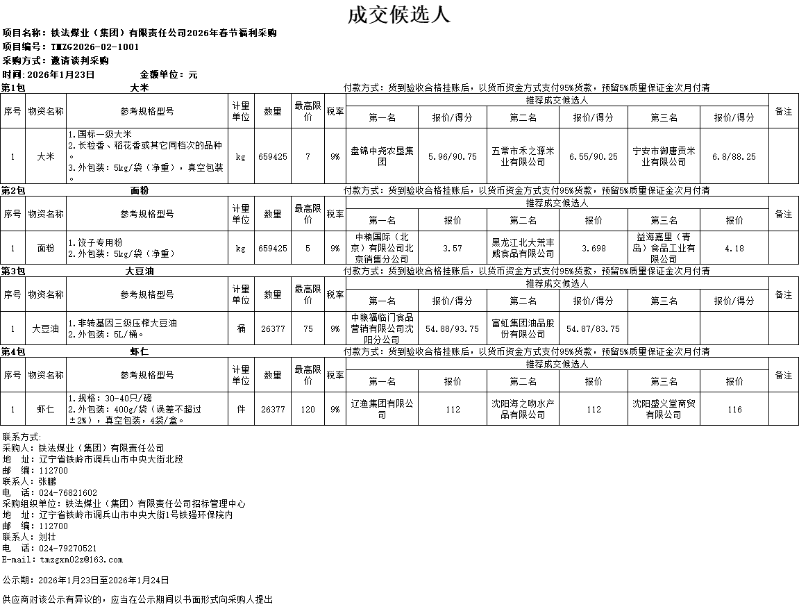 铁法煤业(集团)有限责任公司2026年春节福利采购成交候选人公示