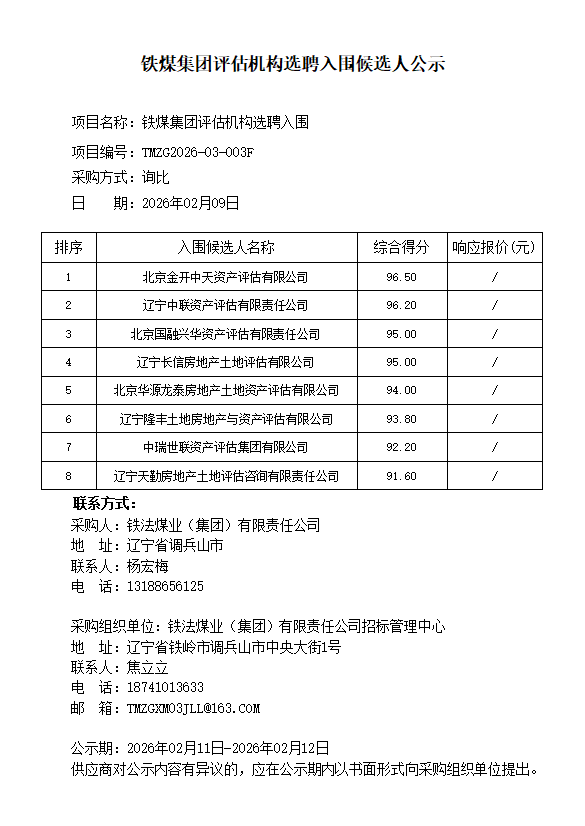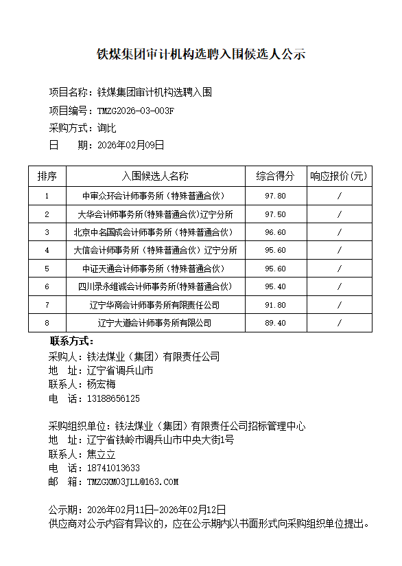 铁法煤业(集团)有限责任公司2026年01月铁煤集团审计机构和评估机构选聘入围候选人公示