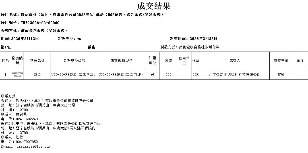 2026年3月12日截齿(U95硬岩紧急采购)成交结果公告