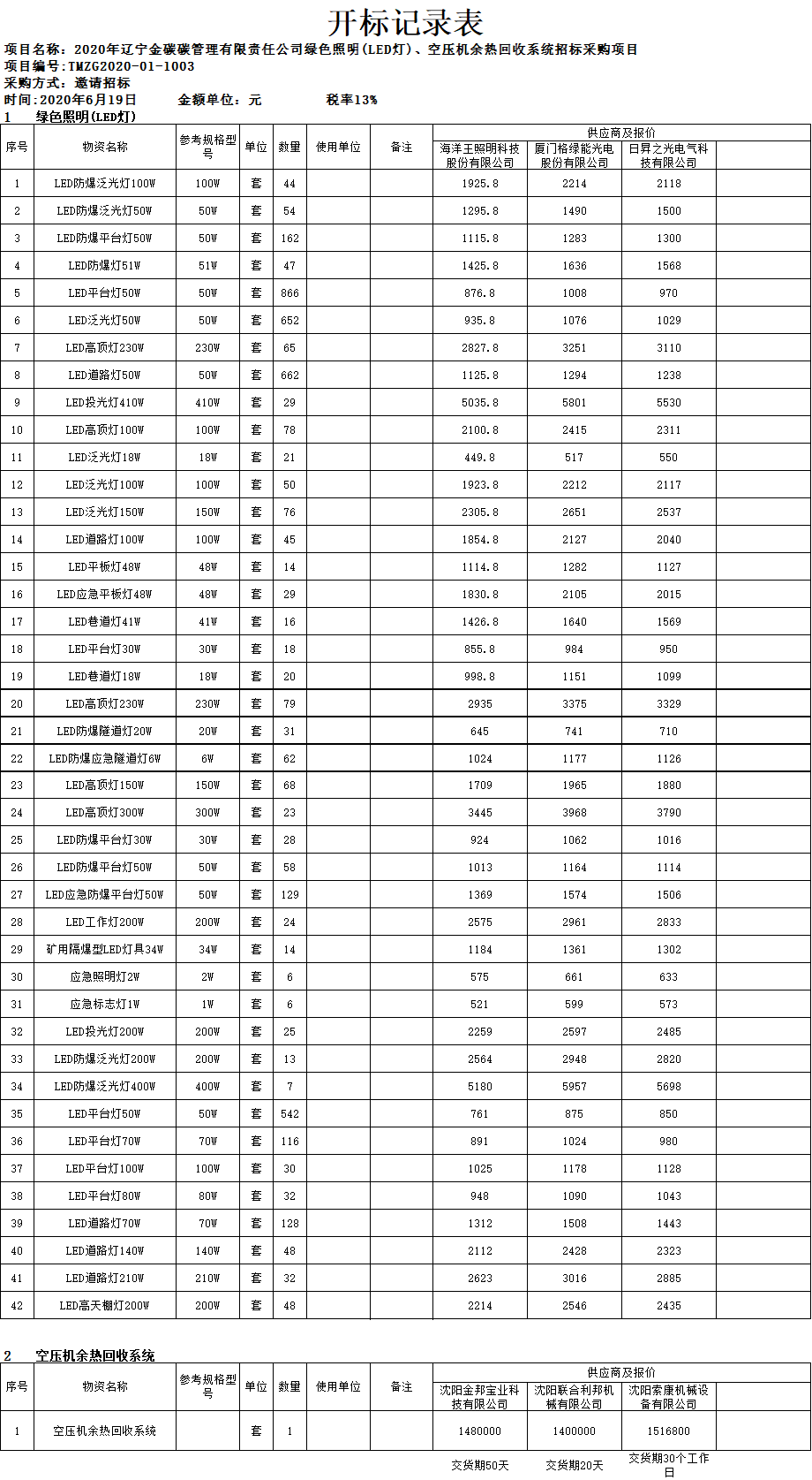 2020年6月19日辽宁金碳碳管理有限责任公司绿色照明(LED灯)、空压机余热回收系统招标采购项目、河南省三门峡市卢氏县林业碳汇项目开标记录表