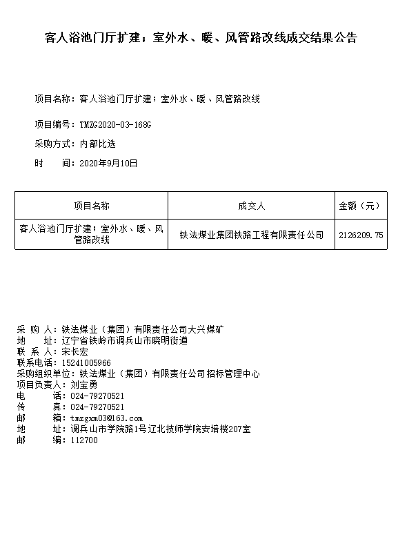 铁法煤业(集团)有限责任公司大兴煤矿客人浴池门厅扩建;室外水、暖、风管路改线成交结果公告