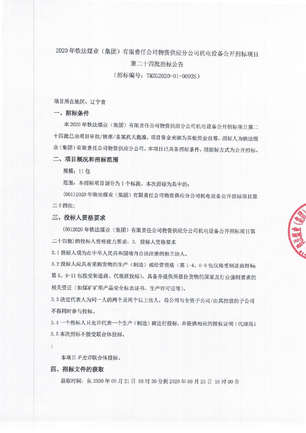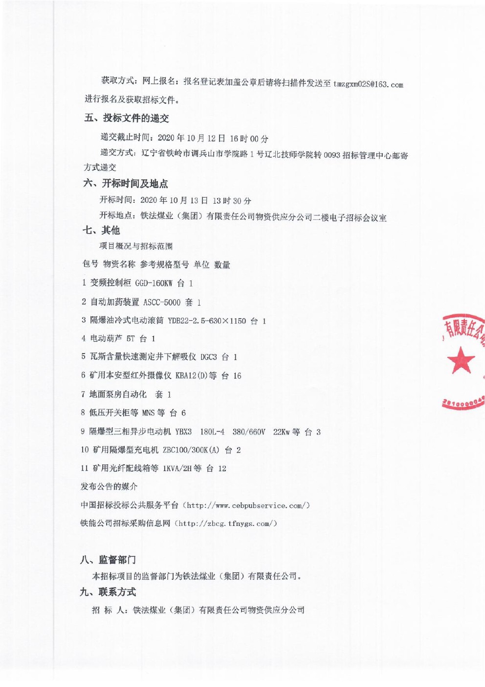 2020年10月13日机电设备第二十四批公开招标公告