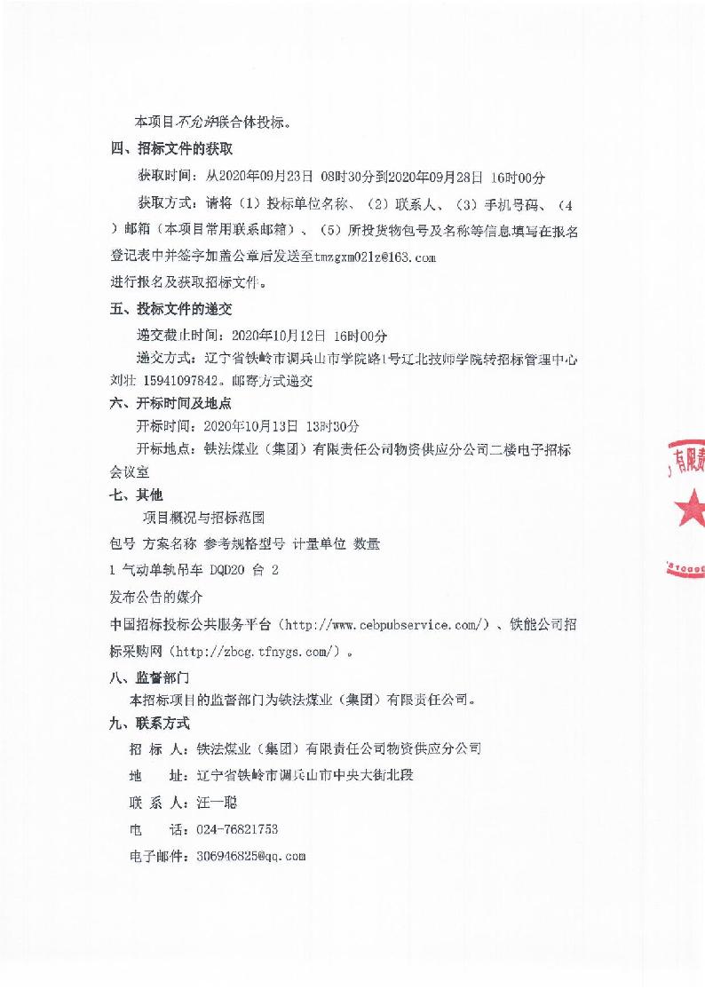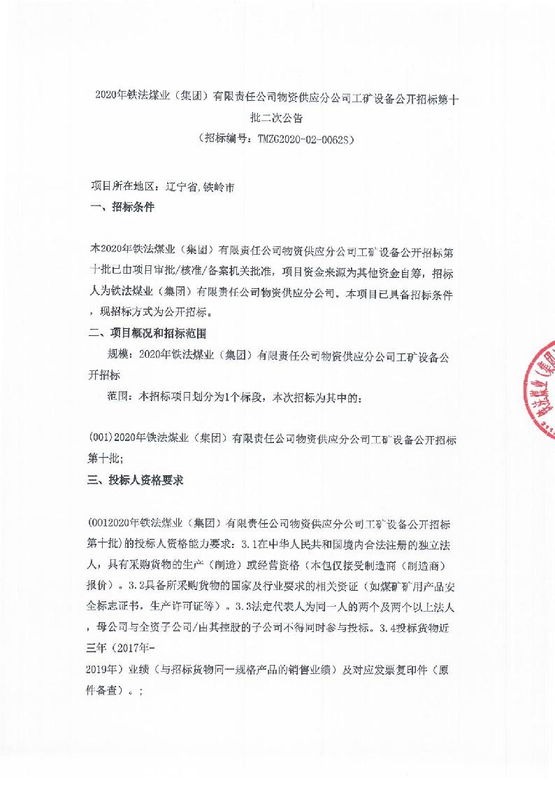 2020年铁法煤业(集团)有限责任公司物资供应分公司工矿设备公开招标第十批二次公告