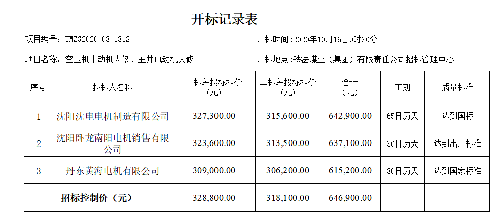 小康煤矿空压机电动机大修、主井电动机大修开标记录表