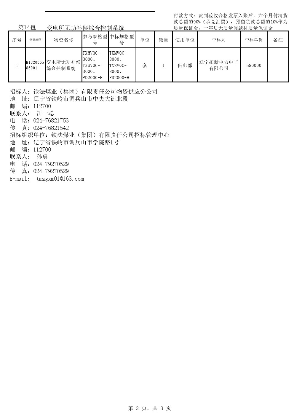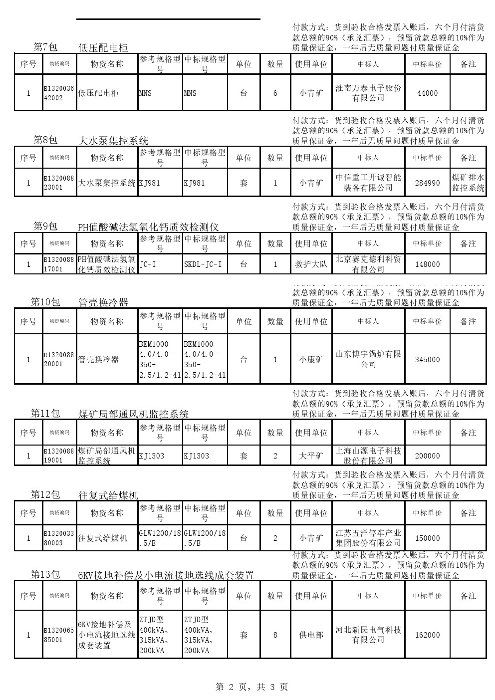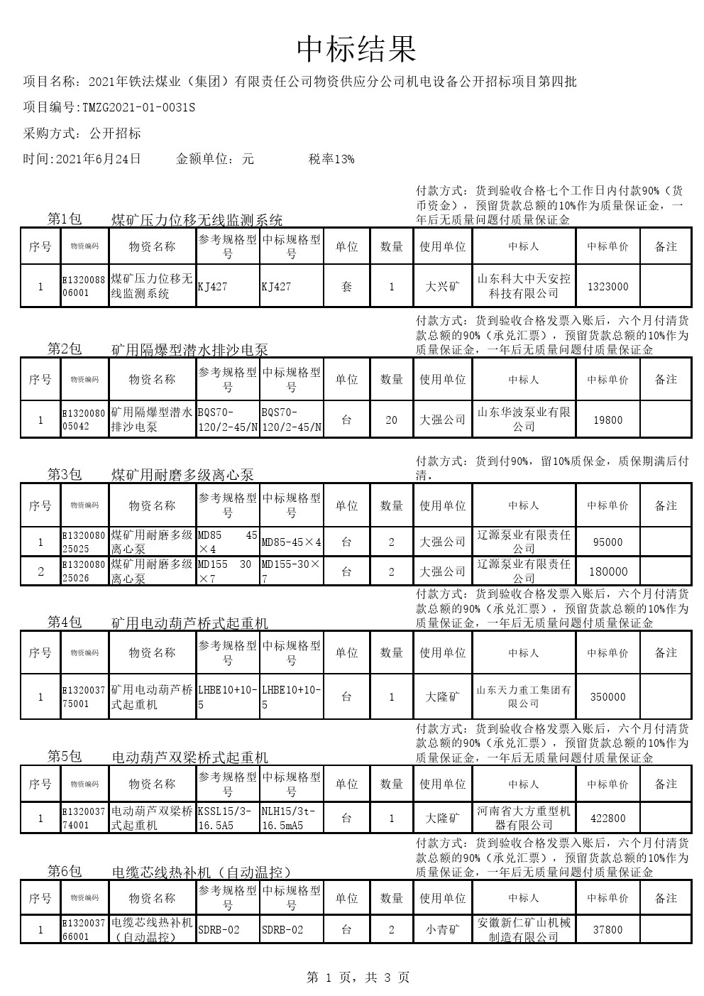 2021年6月24日机电设备中标结果公告