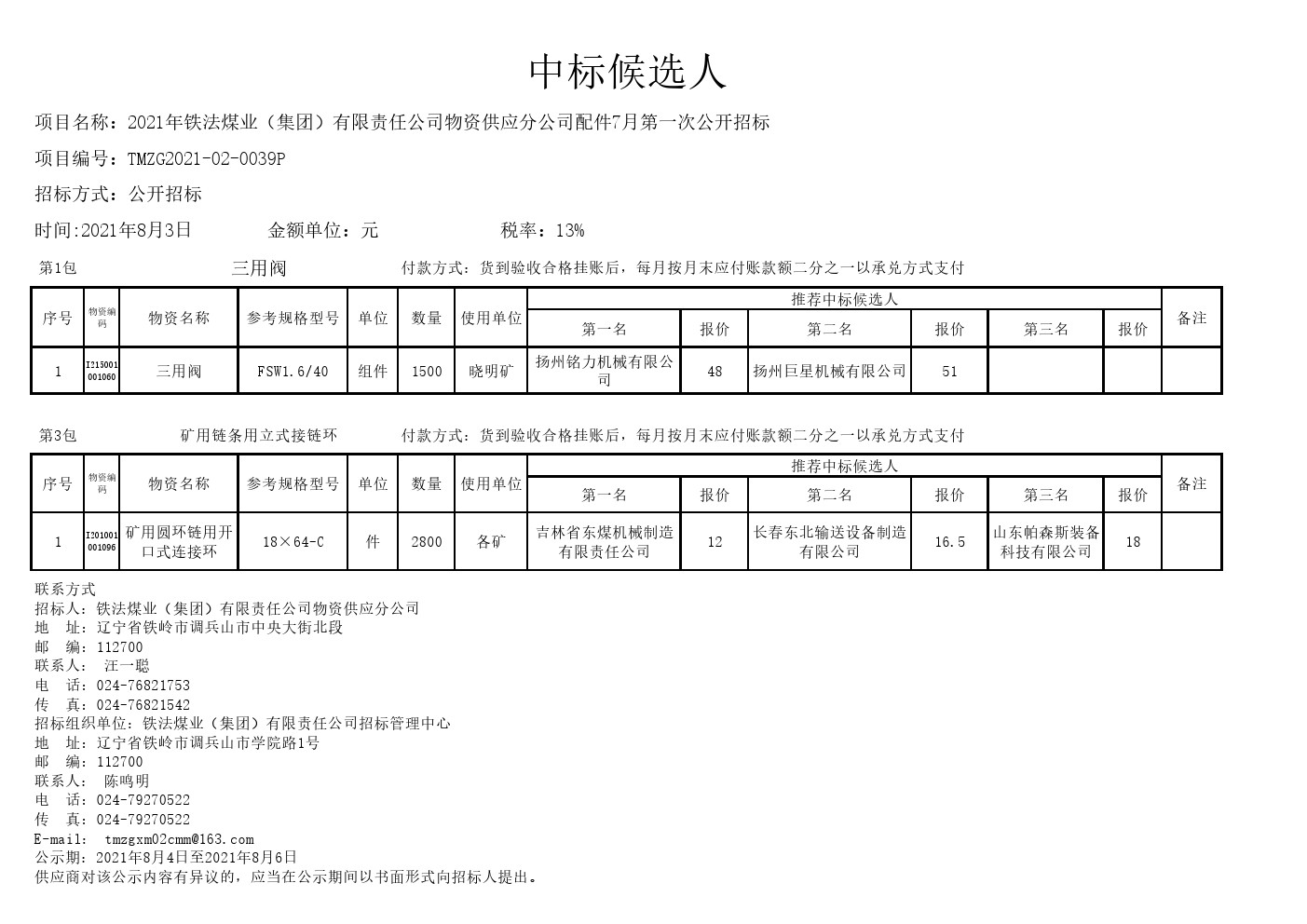 2021年8月3日配件中标候选人公示